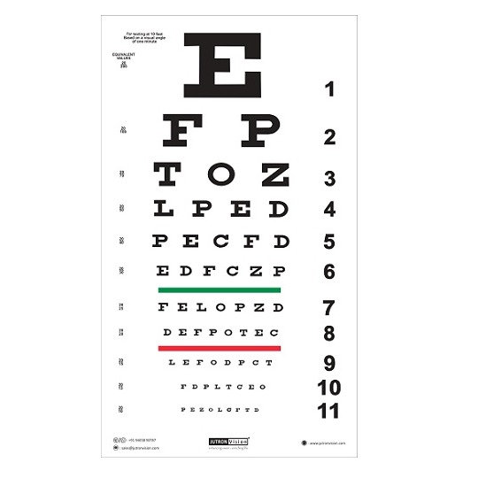 Standard Snellen Chart on styrene, 9 in x 14 in inches (22.9 cm × 35.6 cm). Includes lines for 20/10, 20/13, 20/15, 20/20, 20/25, 20/30, 20/40, 20/50, 20/70, 20/100, and 20/200. Includes 10 Ft Snellen Green bar at 20/30 and red bar at 20/20