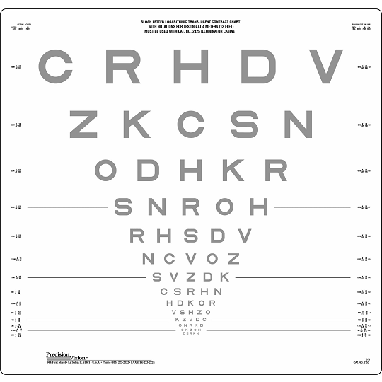 Sloan low contrast vision test features equivalents on each side of the chart. These equivalents include Meters, Feet, LogMar, and Decimal. This list helps in easy translation and conversion of equivalents. Coupled with Sloan letters, true contrast levels and ETDRS style format, this contrast sensitivity test is accurate and reliable.