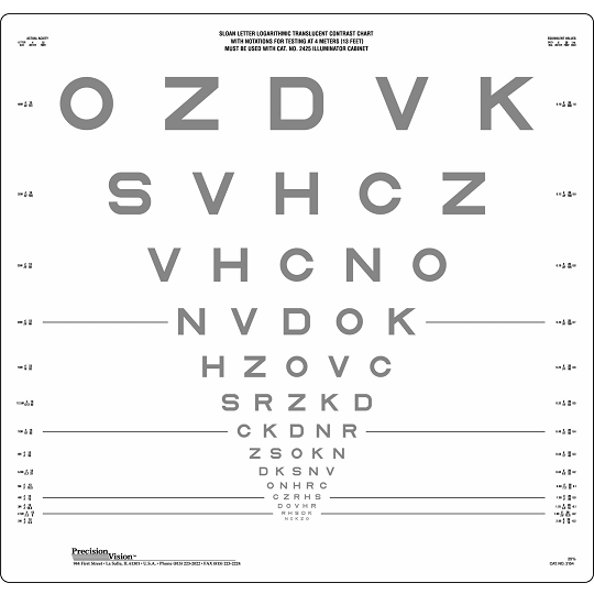 Sloan low contrast vision test features equivalents on each side of the chart. These equivalents include Meters, Feet, LogMar, and Decimal. This list helps in easy translation and conversion of equivalents. Coupled with Sloan letters, true contrast levels and ETDRS style format, this contrast sensitivity test is accurate and reliable.