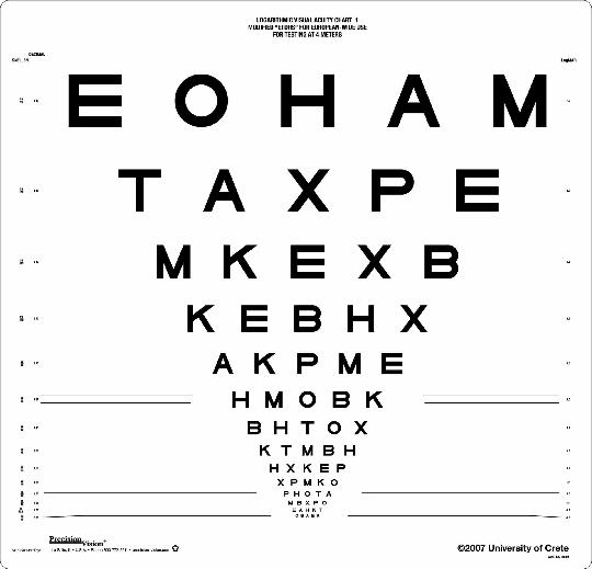 To facilitate reliable visual acuity screening for clinical trials and exchange of patient data between doctors, clinics and researchers throughout Europe and beyond, researchers at the University of Crete (Dr. Sotiris Plainis, Prof. Miltiadis Tsilimbaris and Prof. Ioannis Pallikaris), have developed modified ETDRS® charts that contain only capital letters that are common to all three European alphabets (Latin, Greek, Cyrillic), and are thus recognizable for a much wider population.
