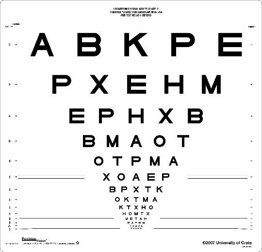 To facilitate reliable visual acuity screening for clinical trials and exchange of patient data between doctors, clinics and researchers throughout Europe and beyond, researchers at the University of Crete (Dr. Sotiris Plainis, Prof. Miltiadis Tsilimbaris and Prof. Ioannis Pallikaris), have developed modified ETDRS® charts that contain only capital letters that are common to all three European alphabets (Latin, Greek, Cyrillic), and are thus recognizable for a much wider population.