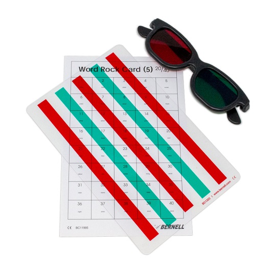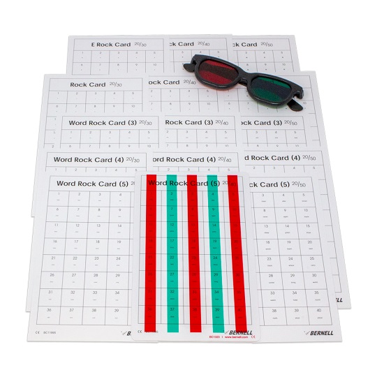The Accommodative Rock Cards Kit includes the 15 cards plus a pair of New Age red/green goggles and the new red/green bar reader (BC1323) that works specifically with the accommodative cards.