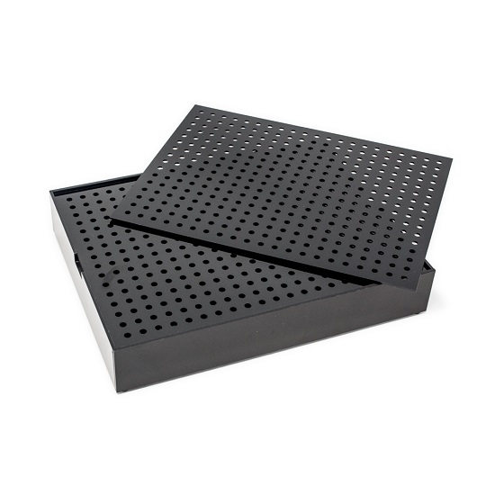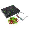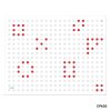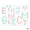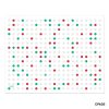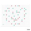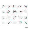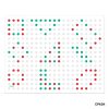 A design of red and green and black is printed on a paper and laid beneath a black plastic holder with 336 small holes drilled in it. One has to look carefully to see what color the dots appear through the holes. You can play several games of placing the same (or the opposite) colored tees punched into the holes. When done, raise the plate holding the tees and the paper will show if you punched the correct colored spots or not.