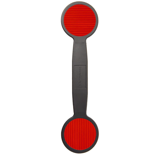 A double ended Red Maddox occluder. One end is flipped horizontally while the other is flipped vertically.