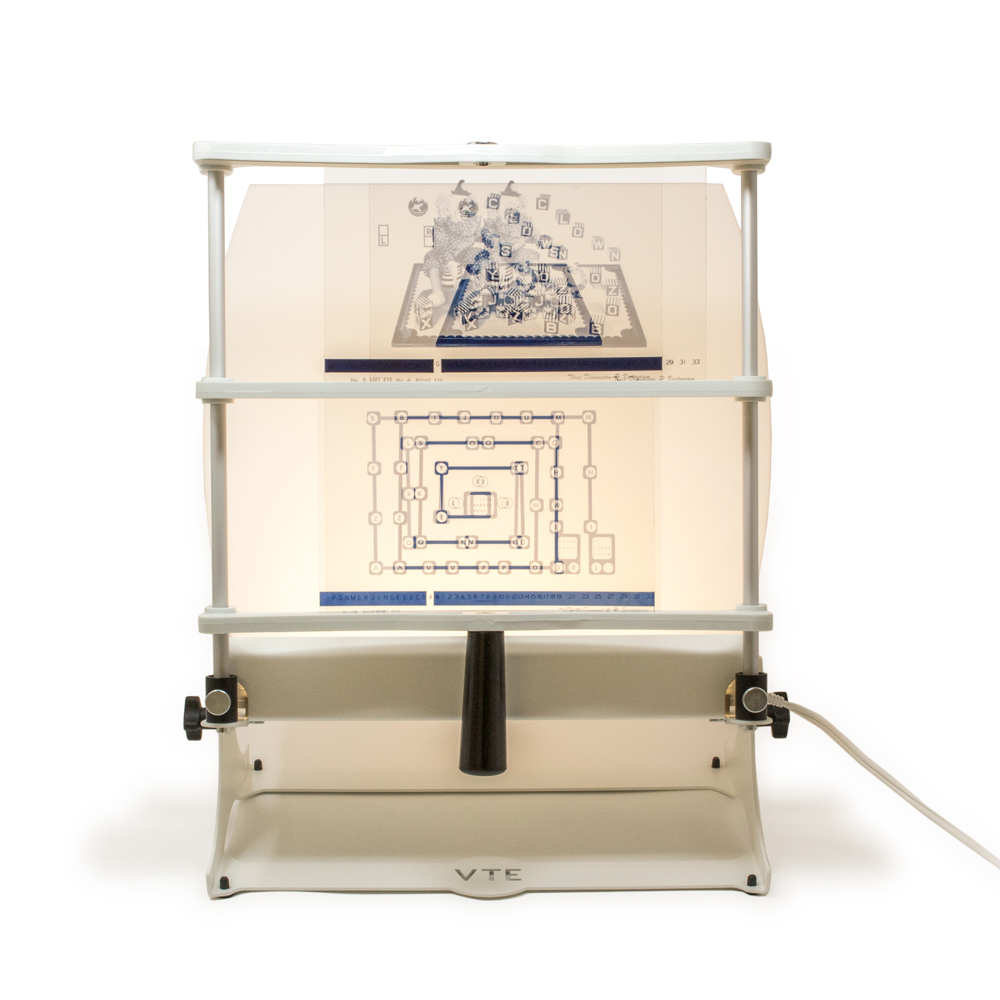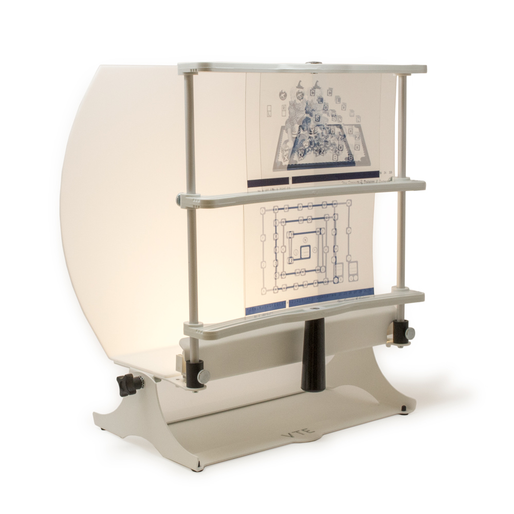 The VTE Dynamic Fusion Slides Holder enhances the effectiveness of your VT program because it allows for the fusion targets (tranaglyph series, transparent fusion cards, Vectograms ) to be used in a variety of conditions. Unique design of the rear screen allows for improve Base-In deep awareness and localization. New lighting sources: LED White – Light gives uniform diffuse lighting over the entire target. 100,000 hours life light guaranteed. The slide holder’s curved profile allows the simultaneous use of three slides. Three tracks which gives additional flexibility of target use and enhanced central-peripheral procedures. Improved target life because the track design reduce scratches. The track of the middle can be moved down or up, it allows to use targets with different heights. Rear screen can be removed for unlimited BI capabilities. One of the most important features of using a removable holder in addition to using a stationary vectogram holder, is that it allows the patient to move for dynamic free space activities (sports version). Removable target holder can be place on an overhead projector for enhanced peripheral stimulation and distance fusion task. Holder and tracks are made of aluminum material: light, resistant and durable.