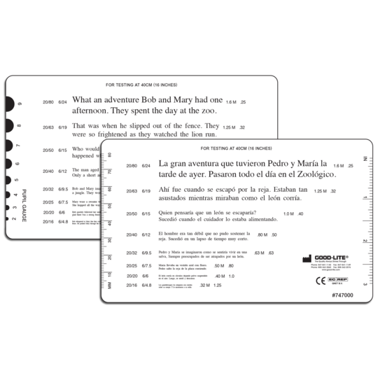 English and Spanish language combination Continuous Text Reading Card for 16 in (40 cm). One side contains simple English sentences in proportionally spaced (logMAR) lines on one side with simple Spanish sentences on the other. Line sizes range from 20/80 to 20/16 (6/24 to 6/4.8) equivalent.
