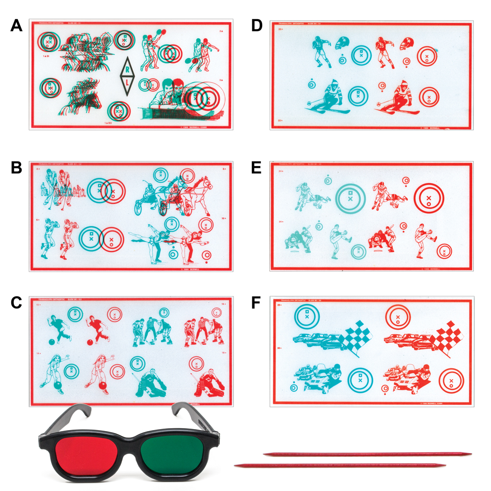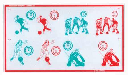 Ideal for testing or training in true space at the office or home. Eliminates suppression while developing fusion and stereopsis. Non-variable prismatic Red/Green slides build fusional convergence & divergence. 2PD increments from 0 to 30PD BI or BO. 10″ x 5.5″ Red/Green targets on frosted vinyl. Can be used with Polachrome Trainer.