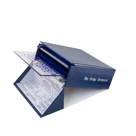 The Frisby is the only stereotest that presents “real depth” objects viewed with natural vision. No testing glasses are required, which means the tester can watch the patient’s eyes and deduce preferential looking, particularly helpful when testing young children.