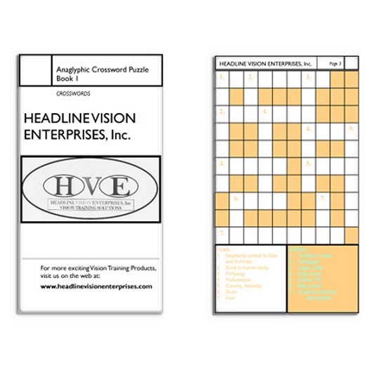 Each booklet contains 13 crossword puzzles which cancel with R/G glasses. Both the puzzle grid and the word clues alternate between right and left eyes so you can get some good BIOCULAR training here! Plus, you can invent other activities, such as scanning, saccadic, or filling in “bubble” letters. The answers are provided in the back of the books, along with supplemental activity ideas.