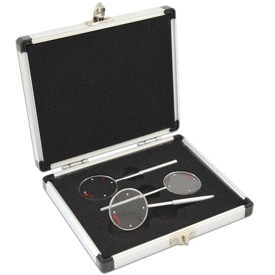 Set of 3 Jackson Cross Cylinders in a metal box with 0.25, .50 and 1.00 lenses. Used to determine orientation of astigmatism correction, the power of the astigmatism correction and the axis. Lenses are 35mm with axis markings and handles are 70mm long.