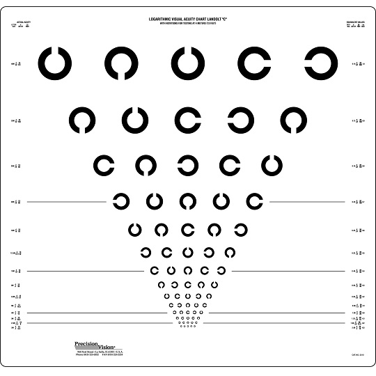 Landolt C charts are considered the gold standard of alternative eye charts since 1988. The chart was developed as an alternative to Snellen chart optotypes, which were not equally difficult. Each chart features only one carefully calibrated optotype placed in different positions (up, down, left, right, and 45 degree positions). The C used in the chart creates an equality throughout testing, giving the patient optimal opportunity. Patients must gesture or say which direction the C is facing, making testing simple and accurate.