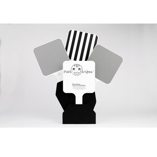 Patti Stripe paddles are highly useful for testing the grating acuity of children, infants, and those with mental disabilities. The grating acuity is tested by placing the gray paddle in front and the grated paddle behind and sliding it out. If the child can see the grating, they will respond by following the paddle. The set includes seven separate CPCM gratings that help to establish a grating acuity level in pediatric patients.