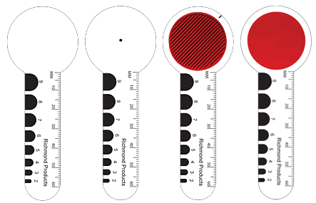Handle in printed with half moon to the edge with 8 sizes: 2 mm to 9 mm and 6cm ruler. Easily fits in a trial lens frame and cleans up with alcohol.