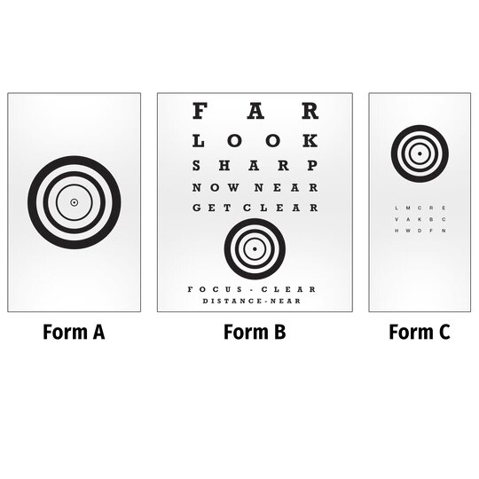 Bullseye targets based on procedures developed by Lawrence W. MacDonald, OD and Baxter Swartwout, OD. Each comes in a pack of 5 translucent forms.