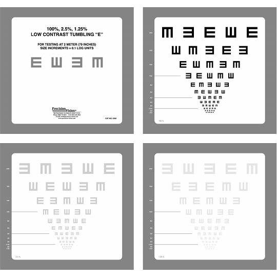 for testing. Patients not familiar with the Roman alphabet simply have to gesture or sign which direction they see the “E” facing. This is a helpful test for patients that are illiterate or mute, also. This Tumbling “E” flip book contains three contrast levels for accurate sensitivity screening.