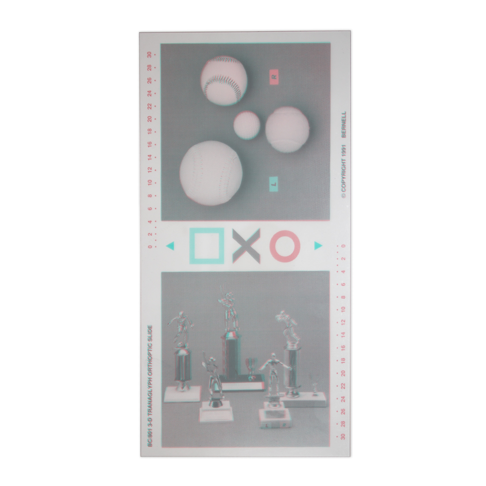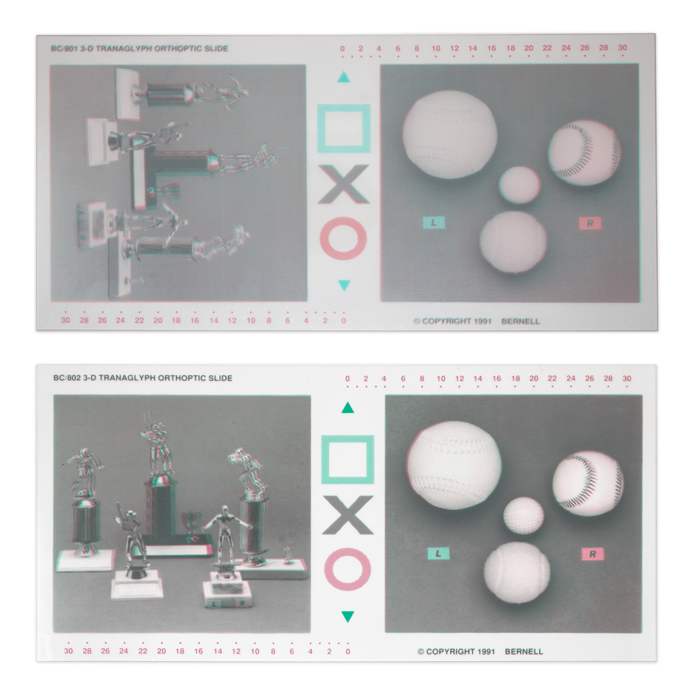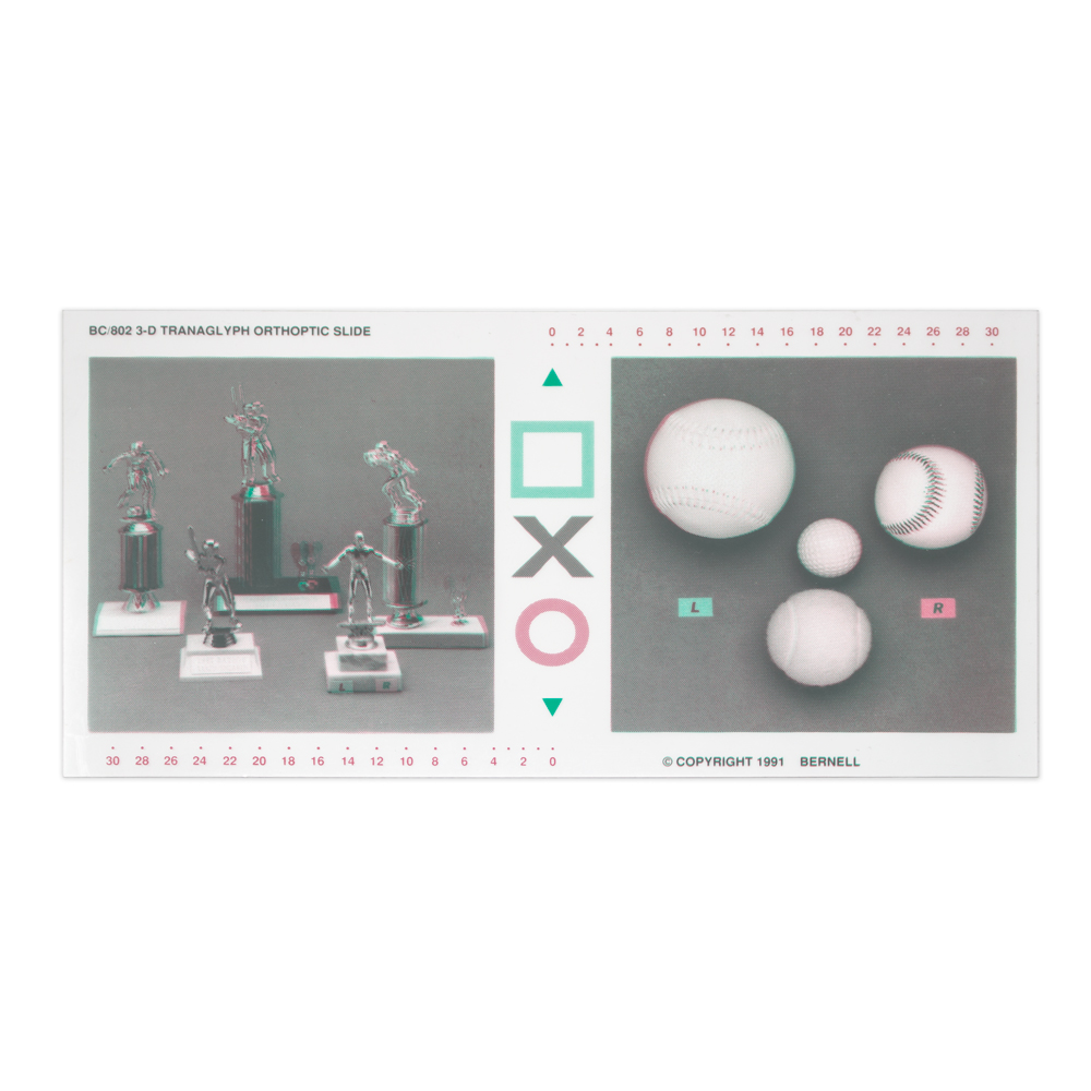 The 802 Slide Set has two horizontal targets with differing stereoscopic demands, and monocular clues for those who might have difficulty achieving or maintaining 3-D images.